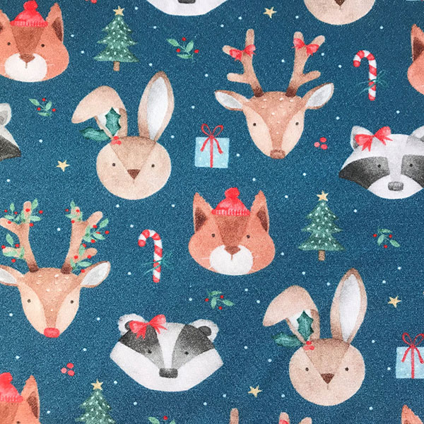 This fun Christmas print is on a light teal blue background with Christmas animal faces, Christmas trees, candy canes, presents & holly. The soft blues, browns, greens & reds should work perfectly with any seasonal outfit!
