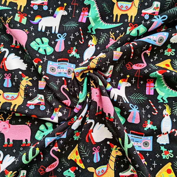 This fun Christmas print is on a black background has everything from Christmas flamingos, Llamas, pigs, unicorns & dinosaurs to gifts, candy canes, cactus & holly too. It’s a gorgeous print that will take you right through the Christmas holiday season…